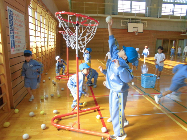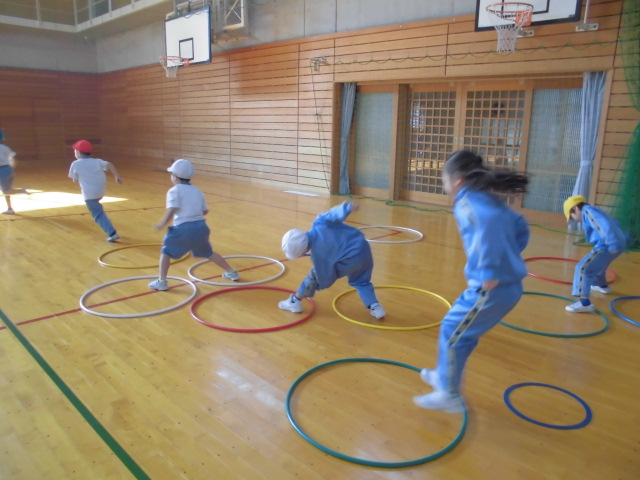 フラフープの中をジャンプしたり、マットの上で前回りをしたり玉入れなどをしたり