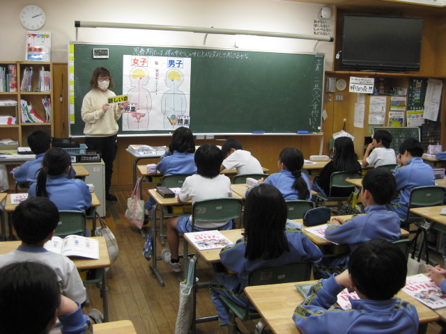 4年生はちょうど思春期に入る時期です。保健の学習では、養護教諭の四柳先生に来ていただき、思春期の体の変化について教えていただきました。わたしたちの体が新しい命を産み出すことのできる体に変化しようとしていることや、それに伴う心の変化について学ぶことができました。