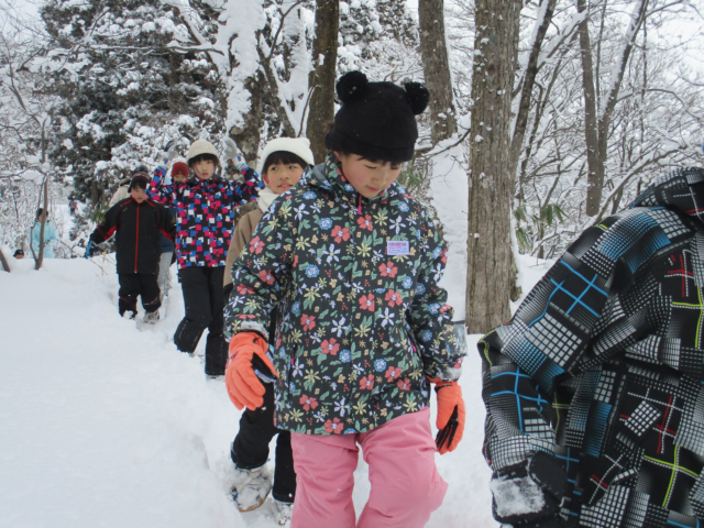 初めてのかんじきのはき方に苦戦しながらも、ふかふかの感触や一面の雪景色を楽しんでいました。大自然の中、思い切り体を動かし、友達と声を掛け合いながら協力する姿が見られました。