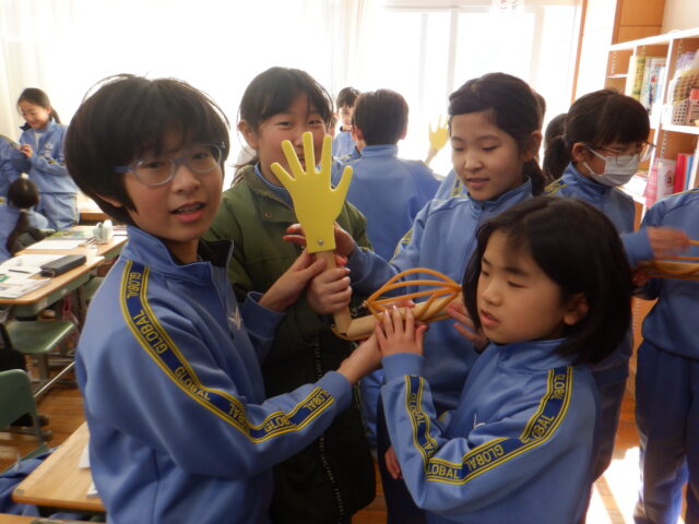 腕や手のつくりの観察では、曲がる部分にシールを貼って記録し、自分たちの腕には硬い骨があり、骨と骨の間には「関節」というつなぎ目があって曲がることを学びました。また、筋肉のはたらきについては模型を使い、腕を曲げるときと伸ばすときでは、動き方が異なることを確かめることができました。