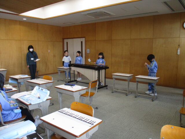 音楽では「汽車は走る」を学習しています。この曲は汽車の走るようすを表した曲です。曲を聴いて、汽車がどのような所を走っているのか想像し、演奏する速さや回数を決めて合奏しました。歌・木琴・鍵盤ハーモニカ・打楽器の4人グループで発表しました。どのグループも工夫があってとても素敵な演奏でした。
