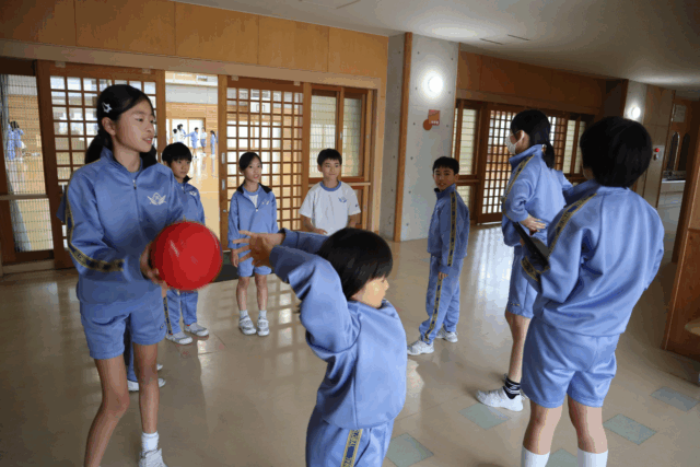 頭の上から体をそって、ばくだん(ボール)を渡し、音楽が止まったときに、ばくだんを持っていた人が『太閤山小学校』のよいところを発表しました。