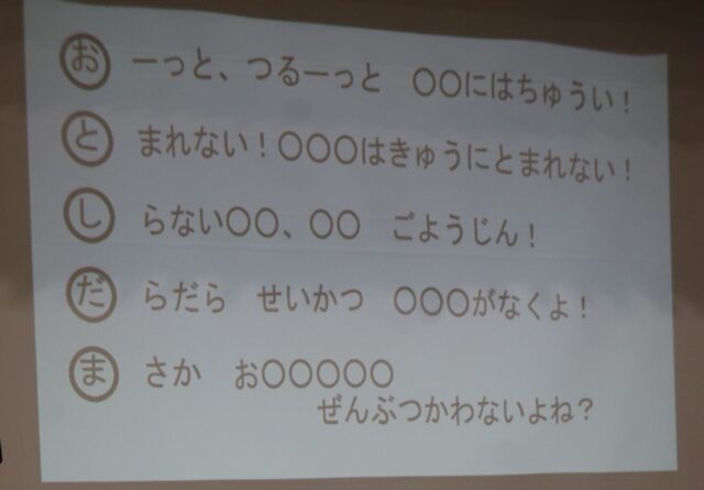 「お」「と」「し」「だ」「ま」の言葉になぞらえて、楽しく冬休みの過ごし方の注意点を確認しました。