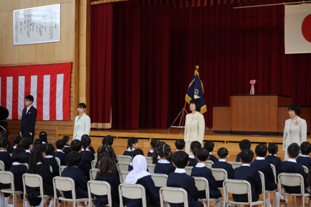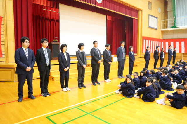 離任される先生方の話を真剣に聴き、子供たちは、感謝の気持ちを込めて、お世話になった先生方に「ありがとうございました。」とお礼を伝えました。教室では、先生方とのお別れを惜しんでいました。
